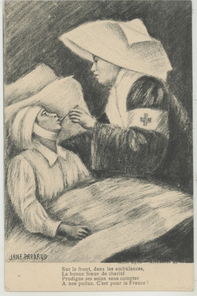 "On the front, in the field hospitals, the good Sister of Charity offers her care to our men without counting the cost. It's for France!"