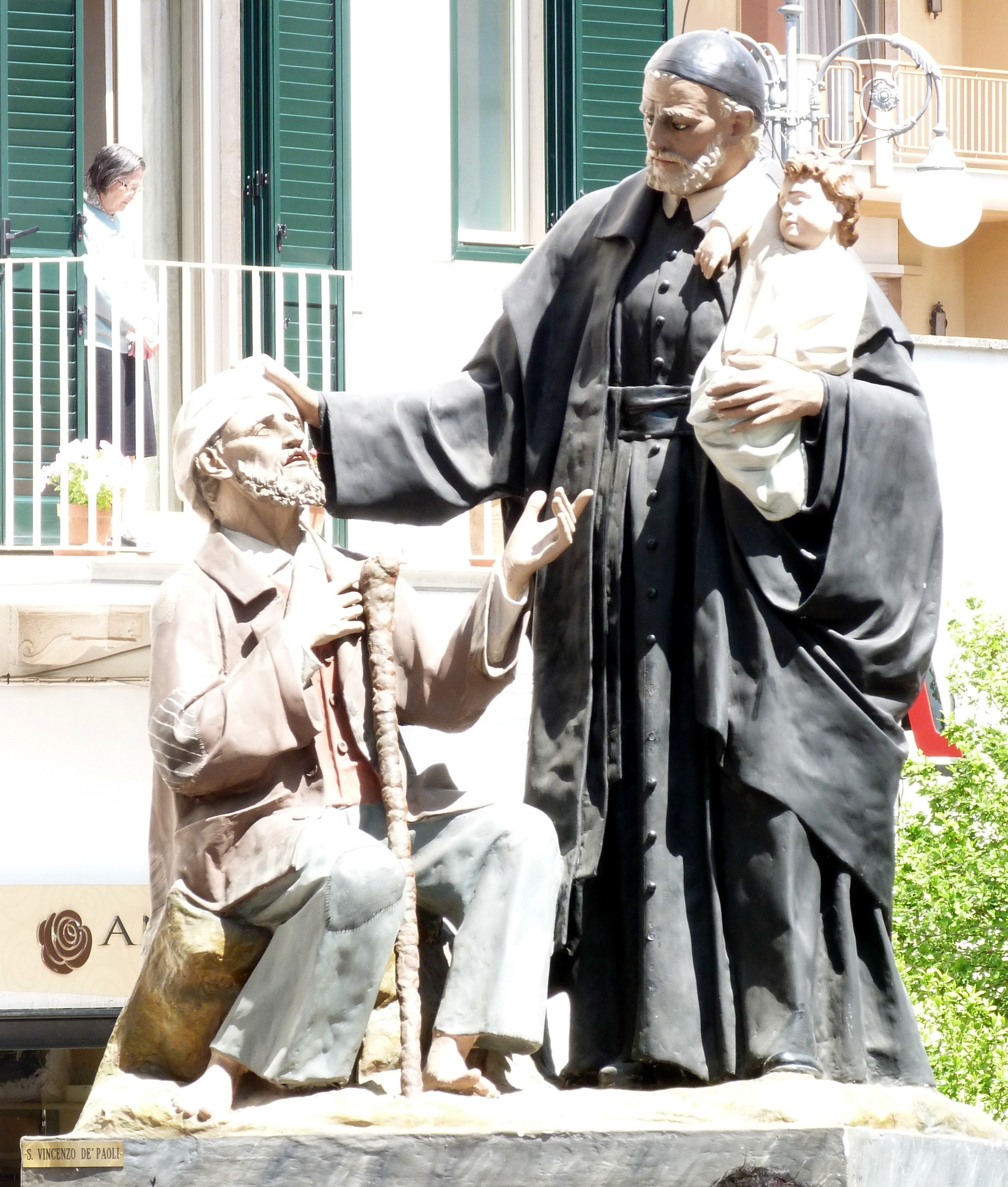 VdP comforting a blind man, holding a child; data not given