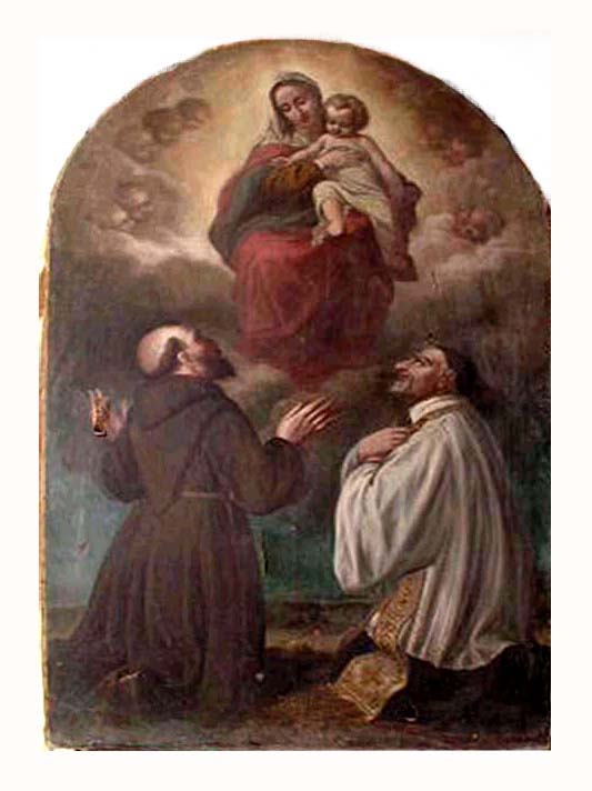 Oil painting, Vincent de Paul, cassock, surplice, stole, skullcap, kneeling with a Capuchin before Virgin Mary and Jesus. Original in Vincentian house, Thessalonika