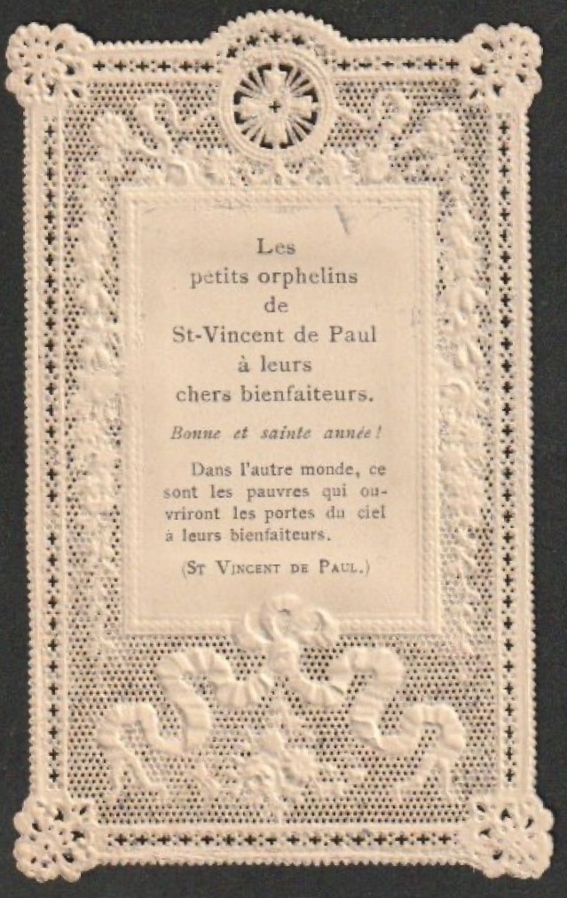Text: The little orphans of SVdP to their dear benefactors: good and holy year! In the other world, the poor will open the dates of heaven to their benefactors.
