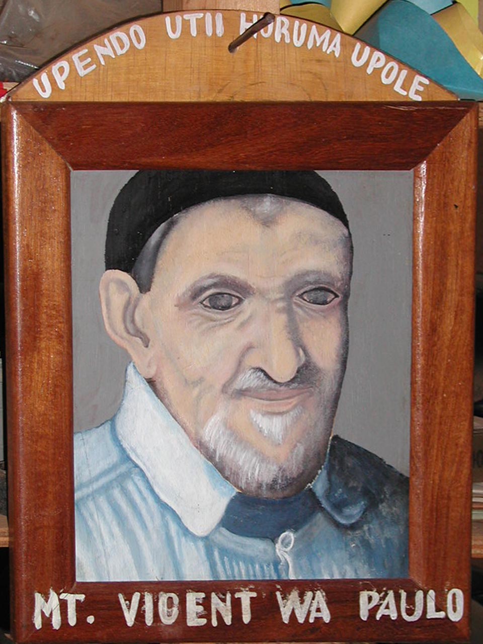 Framed painting; Vincent de Paul, cassock, surplice, eyes unfinished; name and quotation in Swahili on frame; original in Sisters of Charity mother house, Songea