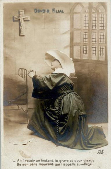 Text: Ah! Just to see for a moment the grave but sweet face of her dying father, who calls her to the village