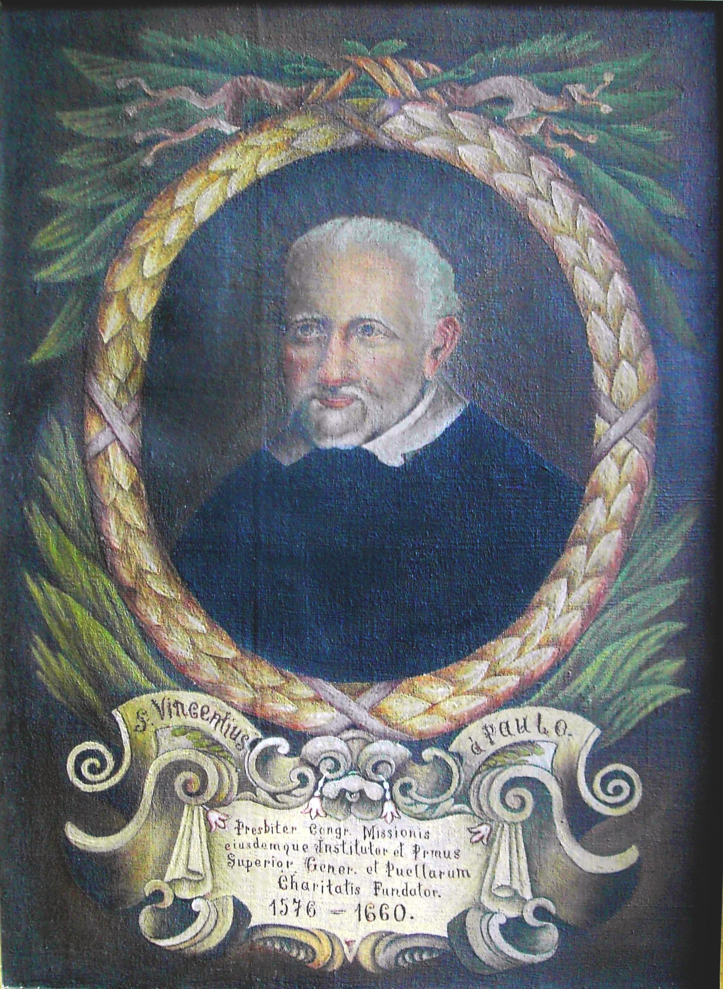 Vincent de Paul, oval portrait; Latin text: Priest of the Congregation of the Mission, its founder and first superior general, and founder of the Daughters of Charity. Original in Krakow, ul. Św. Filipa 19.