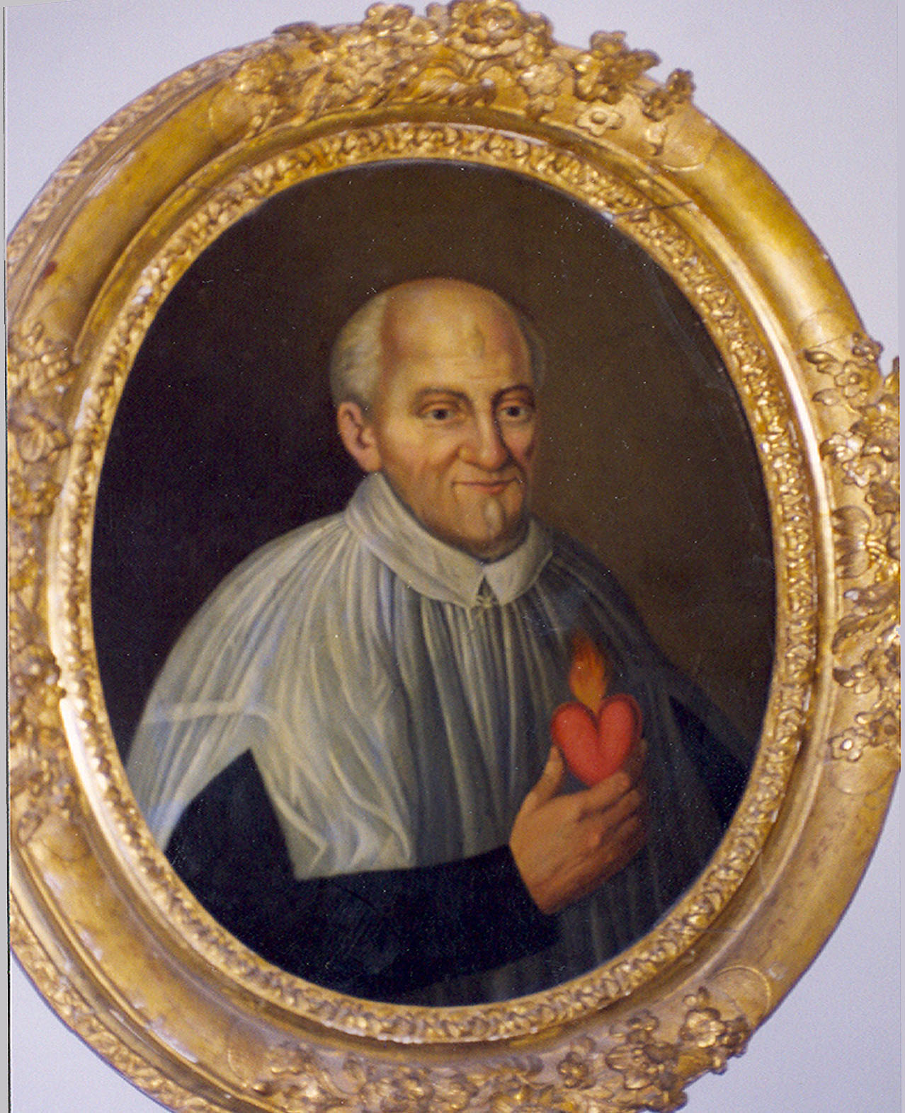 Oval oil painting; Vincent de Paul in surplice, holding flaming heart of charity. Original in Tougin hospice, Gex.