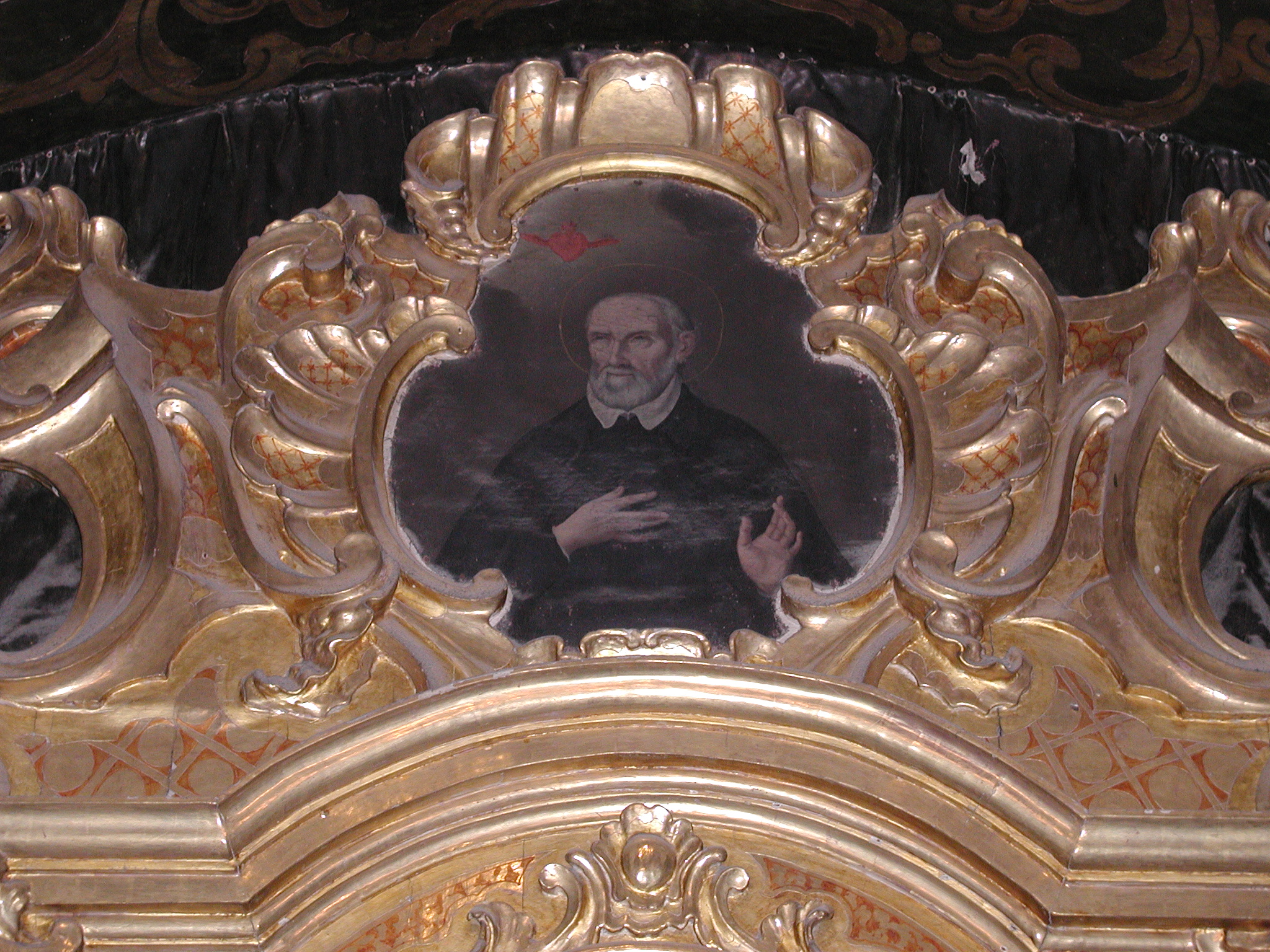 Oil painting above altar, Vincent de Paul shown with flaming heart of charity above his head. Original in Vincentian chapel, Palma de Mallorca, Spain