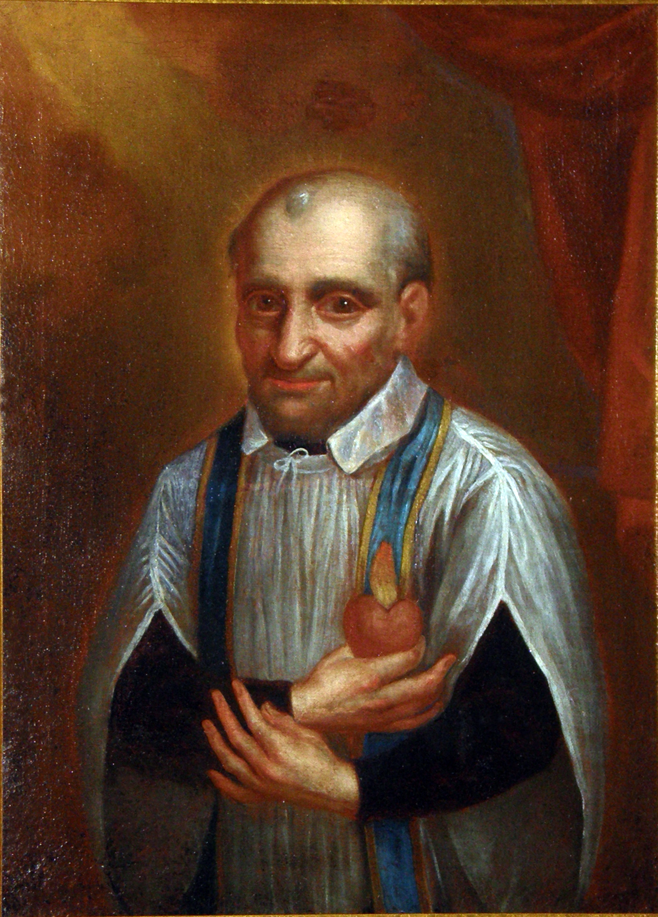 Oil on canvas; Vincent de Paul, small body, large head; standing, cassock, surplice, no skullcap; blue stole; holding heart; original at DePaul University, Chicago