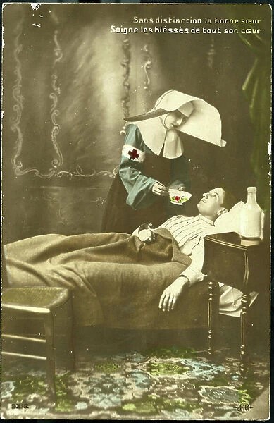 Text: Without any distinction, the good Sister cares for the wounded with her whole heart