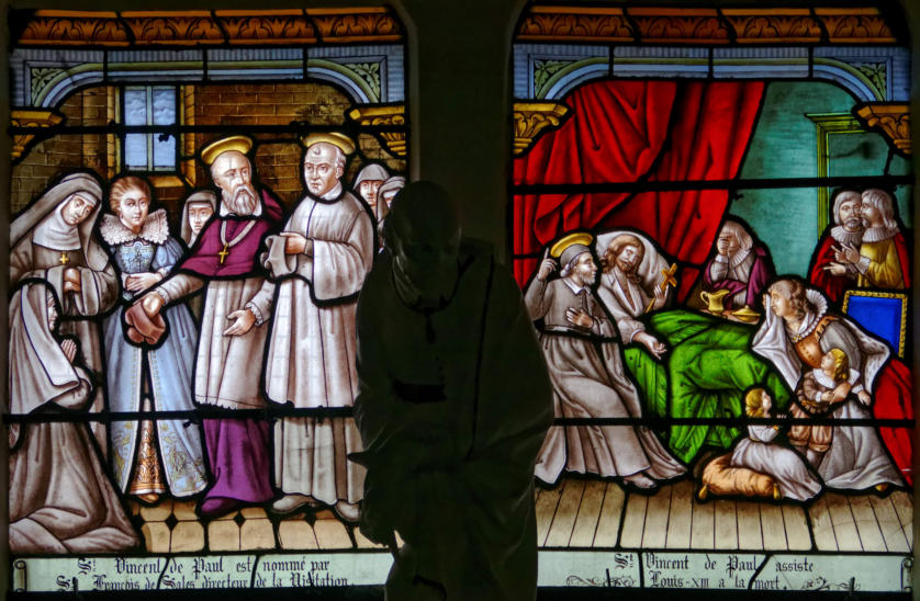Two panels: (l) VdP, Francis de Sales, Jeanne de Chantal; (r) deathbed of Louis XIII