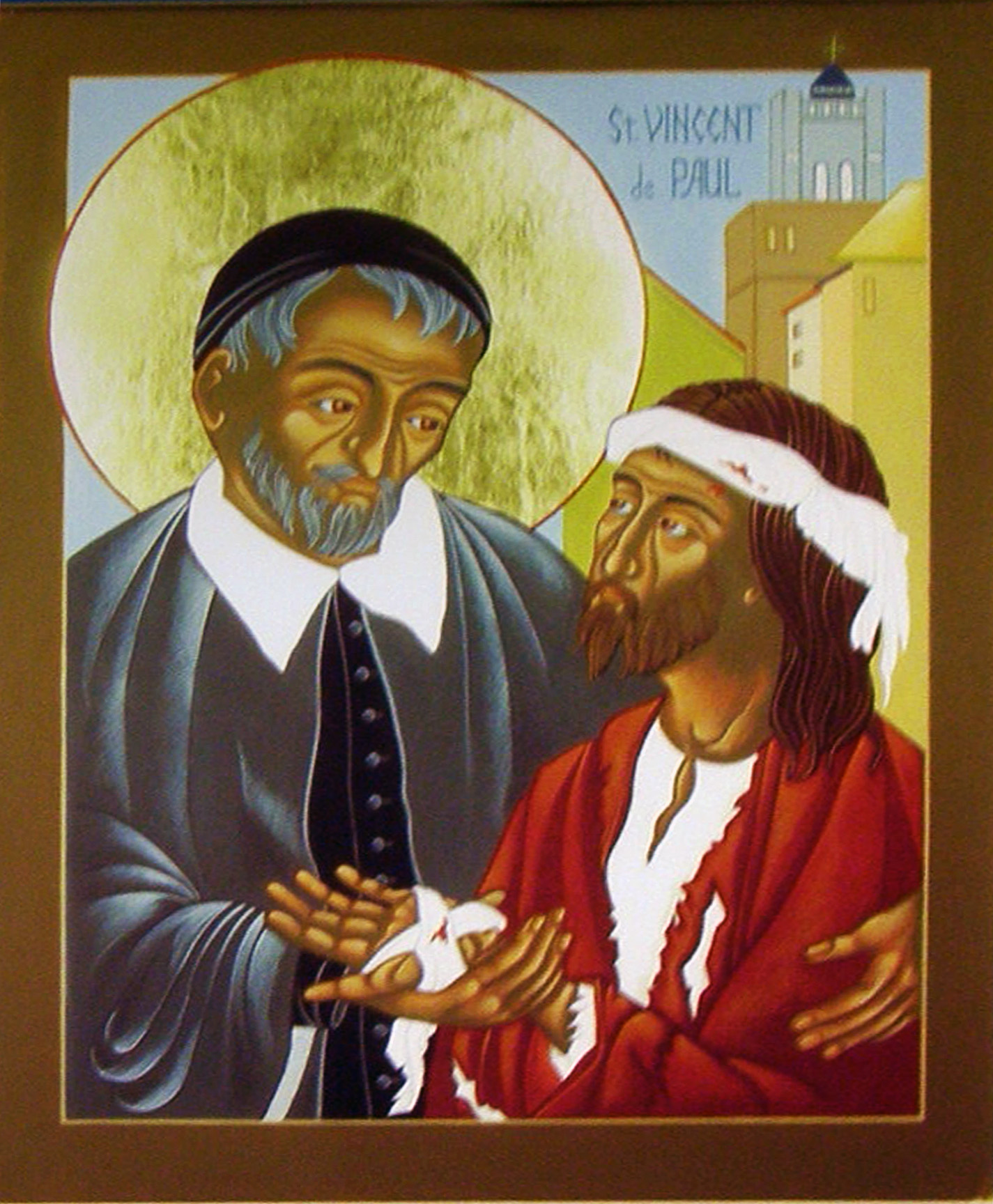 Icon (or icon print), Vincent de Paul, standing, cassock, cape, skullcap, harge halo; with wounded man in white and red (face of Jesus?); in St. Joseph Provincial House