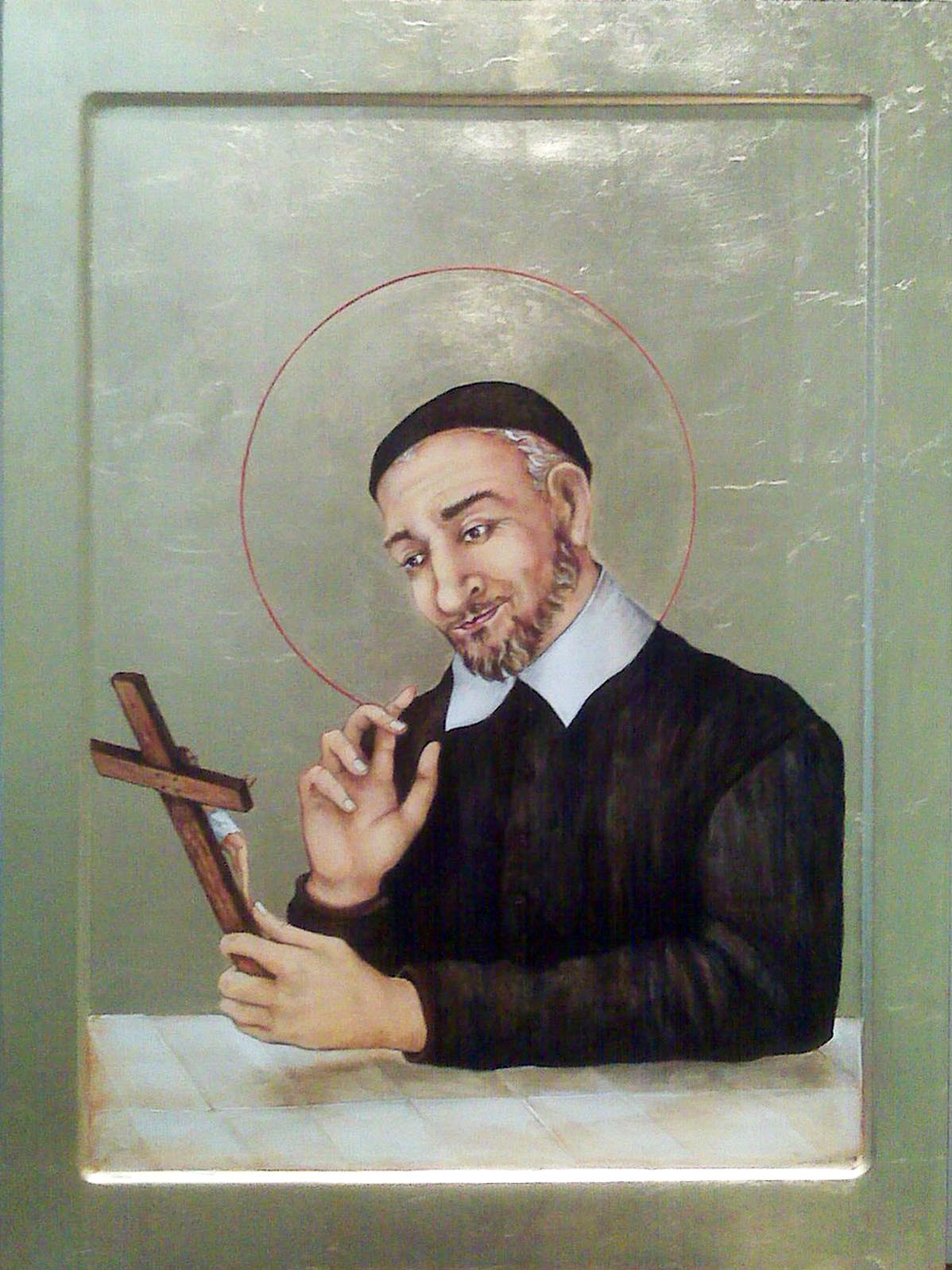 Painted panel, gilded; Vincent de Paul, at table with white cloth, cassock, mantle, skullcap, red halo; holding crucifix; Vincentian house, Tesson Ferry Rd., St. Louis, MO 2010; by Meltem Aktas