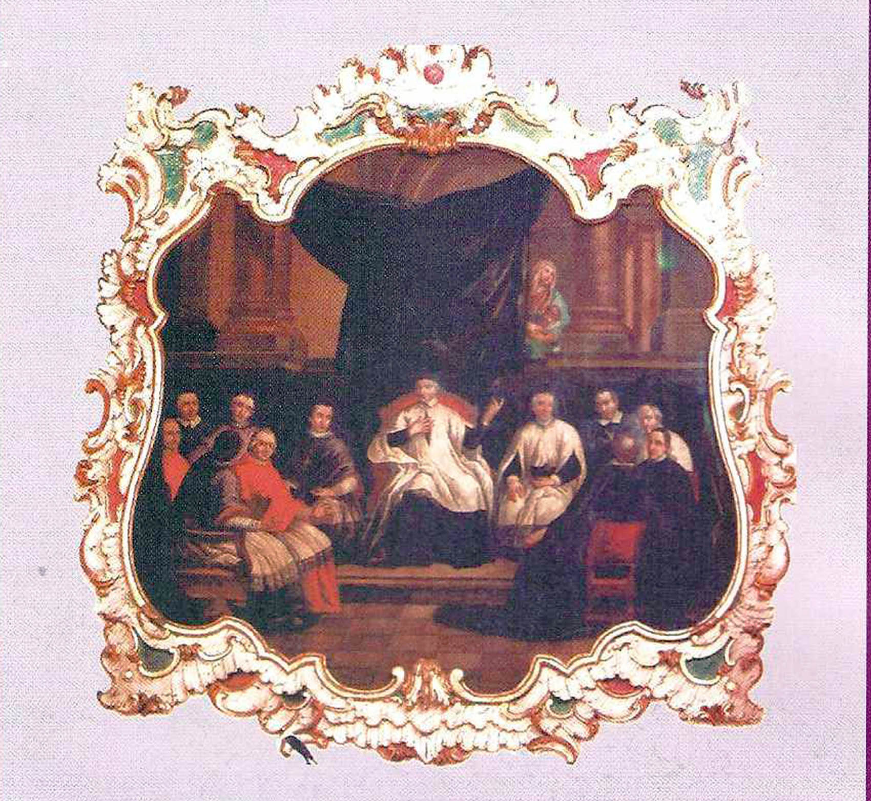 Framed painting, Vincent de Paul and the Tuesday Conference members; copy of beatification painting or engraving; original in Vincentian church, Palma de Mallorca