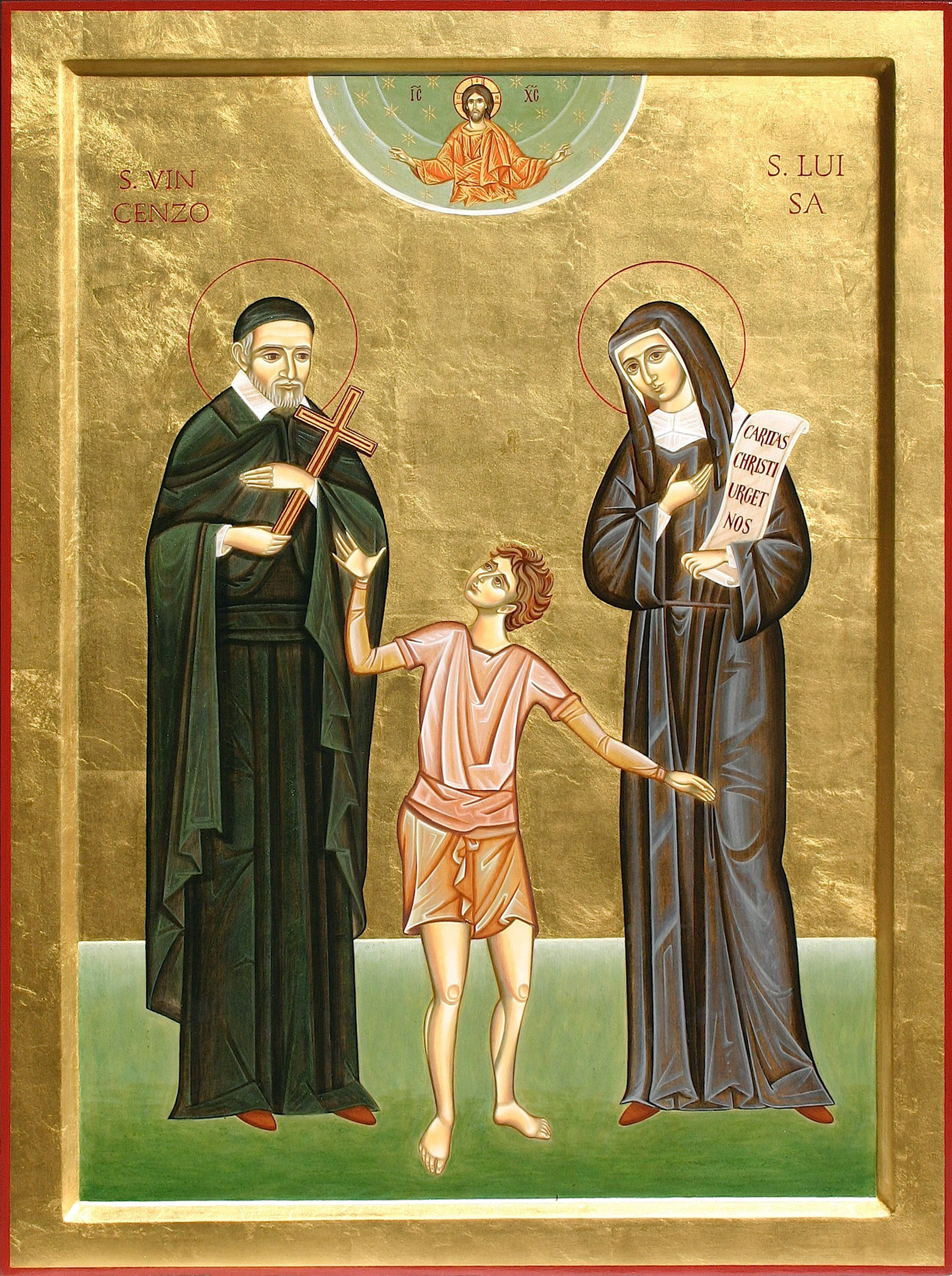 Vincent de Paul, standing, in cassock, cincture, cape, skullcap, red shoes, holding cross; Louise in grey habit, widow's veil, red shoes, holding scroll with motto of Daughters of Charity. Jesus above in semicircle. Poor man, shoeless, in center.