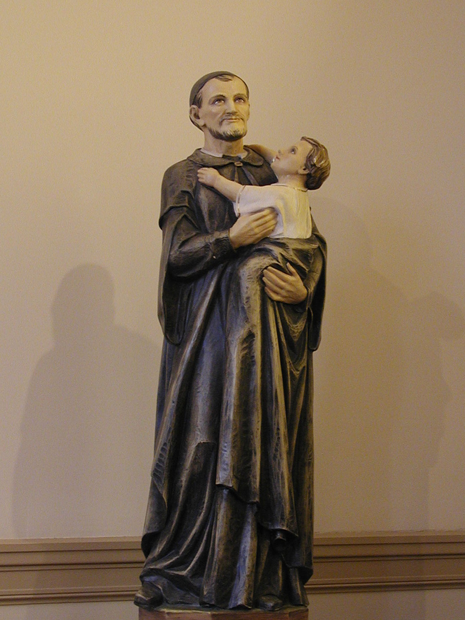 Carved wooden (plaster?) statue, painted, Vincent de Paul, looking up, holding child; original in Catholic Charities offices, Chicago