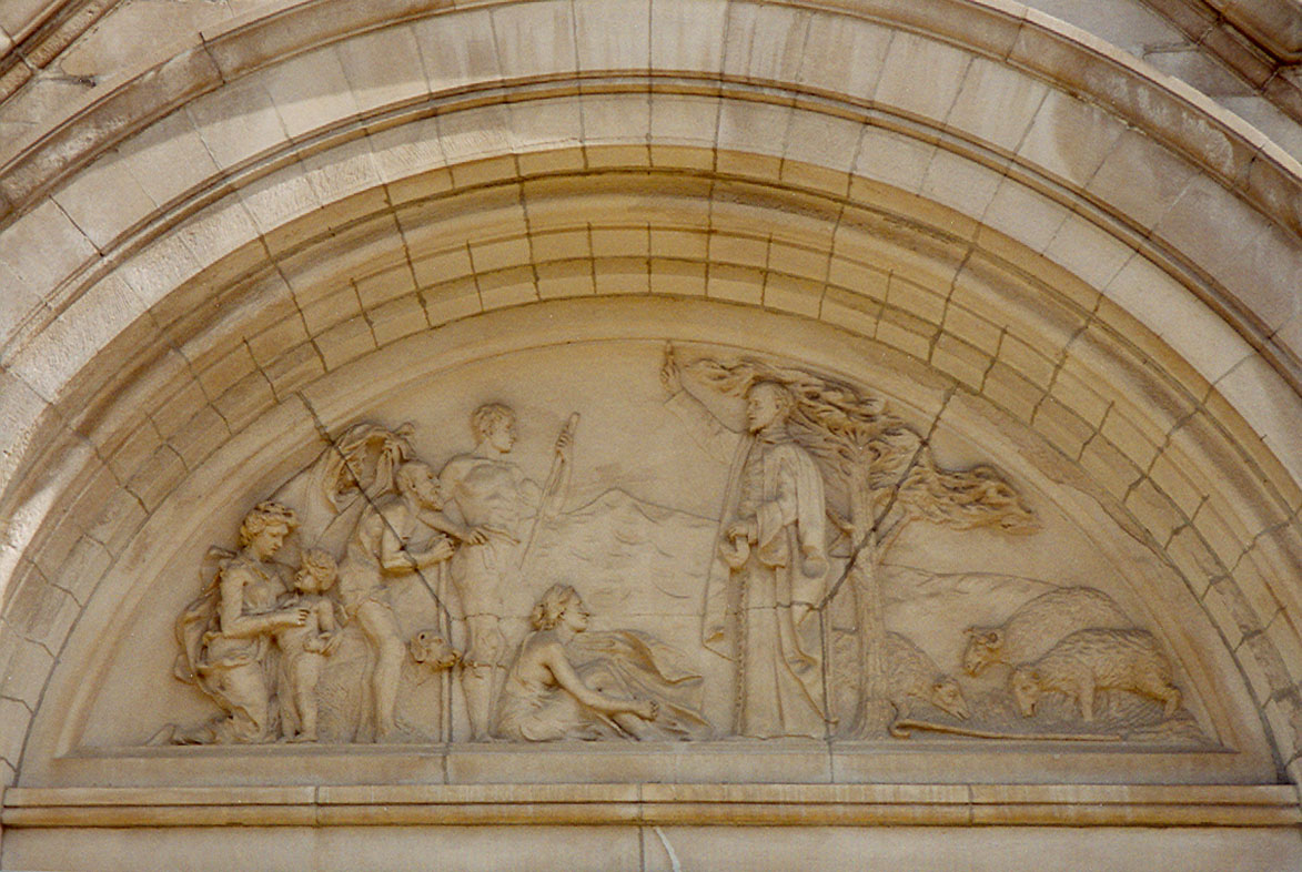 Carved stone, Vincent de Paul blesses works, missionaries, poor, children. Sheep at one side, mountain behind. St. Vincent de Paul parish, entry, Chicago