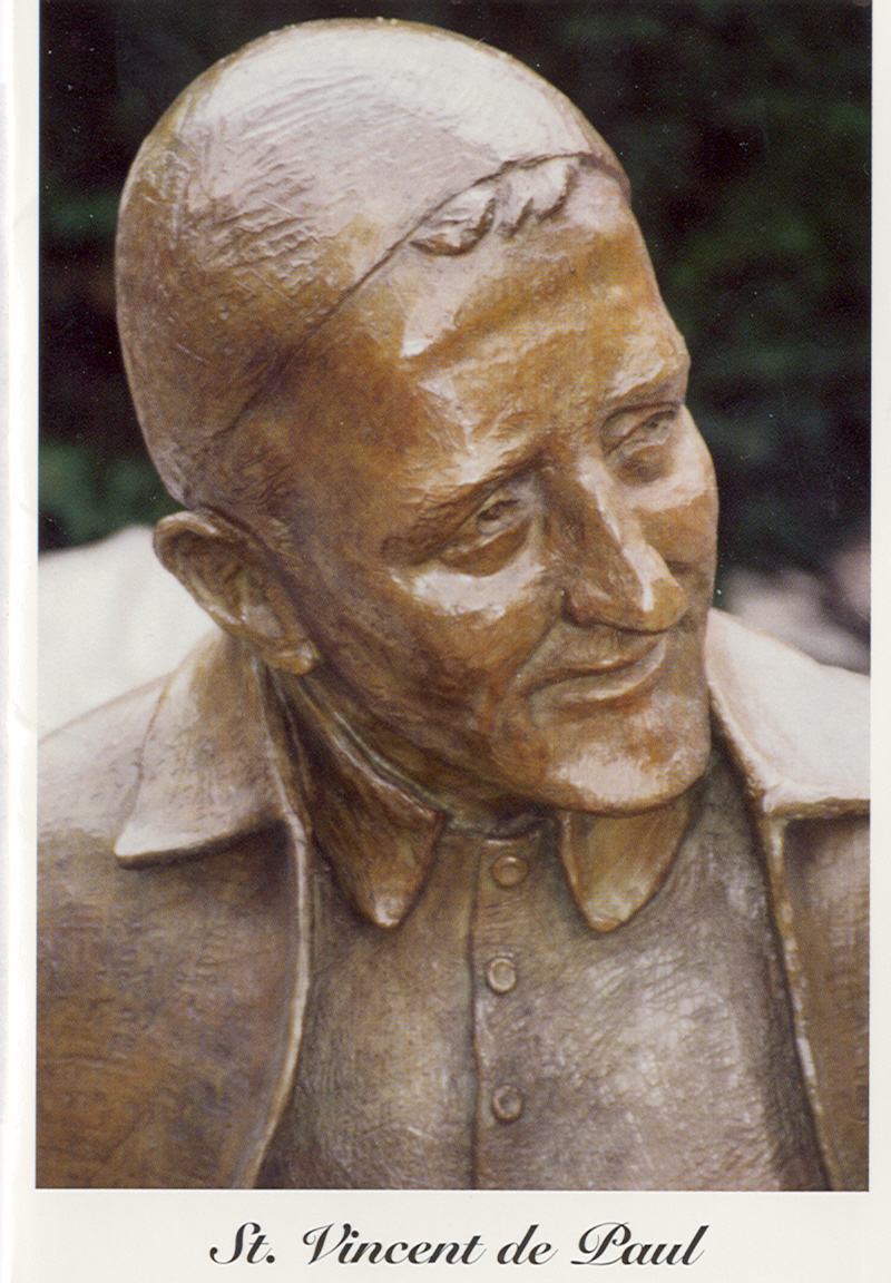 Bronze group; Vincent de Paul with two students; by Sr. Margaret Beaudette, SC; original at DePaul University