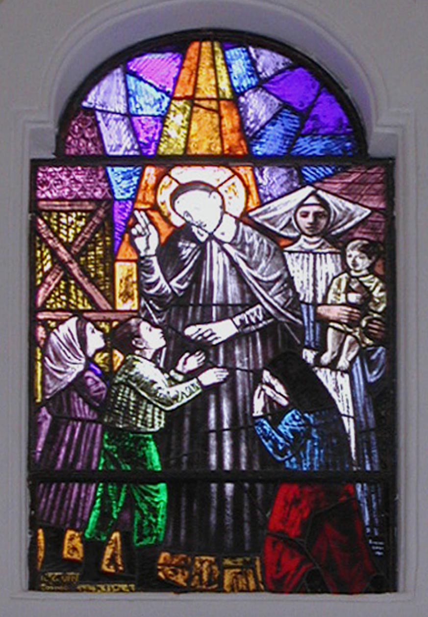 Vincent de Paul blessing three children; Daughter of Charity and child in background. Original in seminary, Oria, Italy.