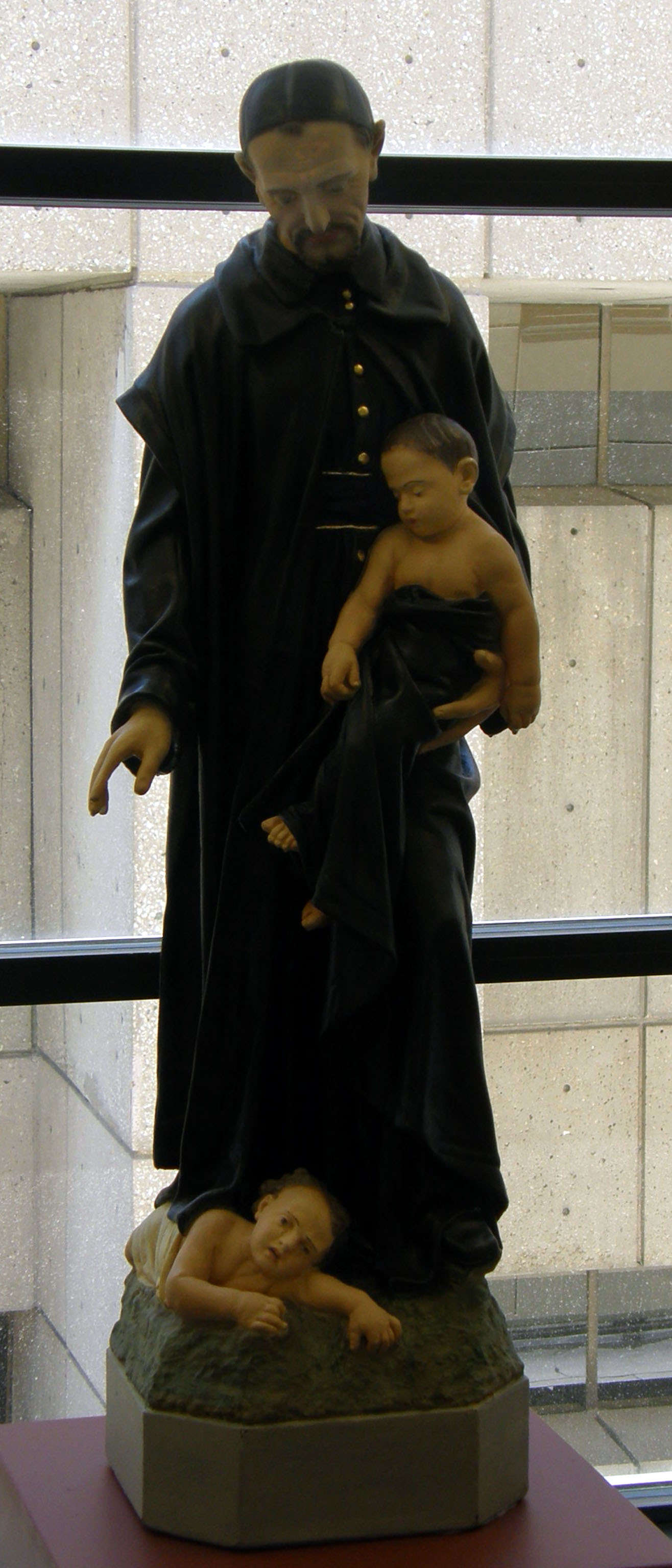 Painted plaster statue; Vincent de Paul, cassock, mantle, skullcap; holding one child, another laying at his feet (based on Stouf original); original at DePaul University, Chicago