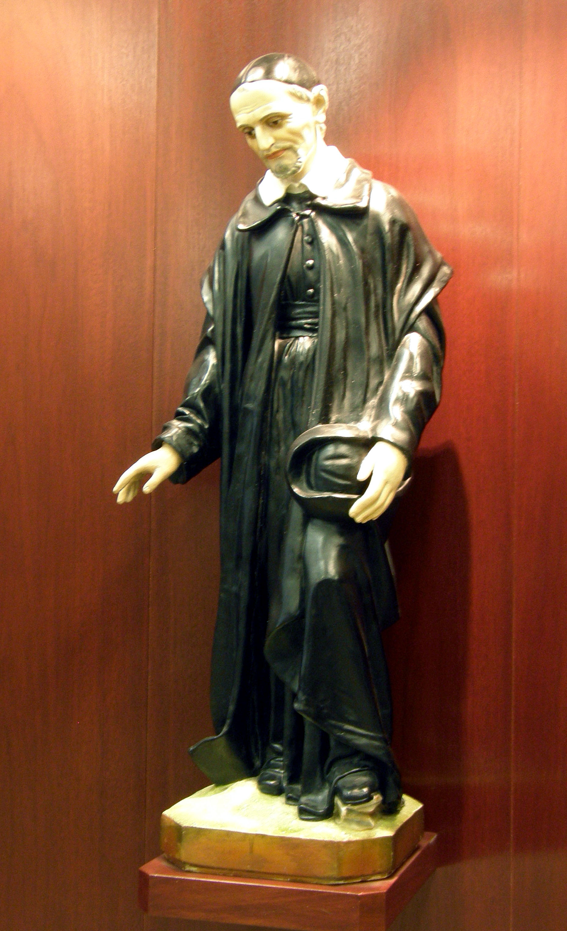 Carved wooden statue, Vincent de Paul, standing, cassock, mantle, skullcap, holding hat, gesturing down; original at DePaul University, Chicago