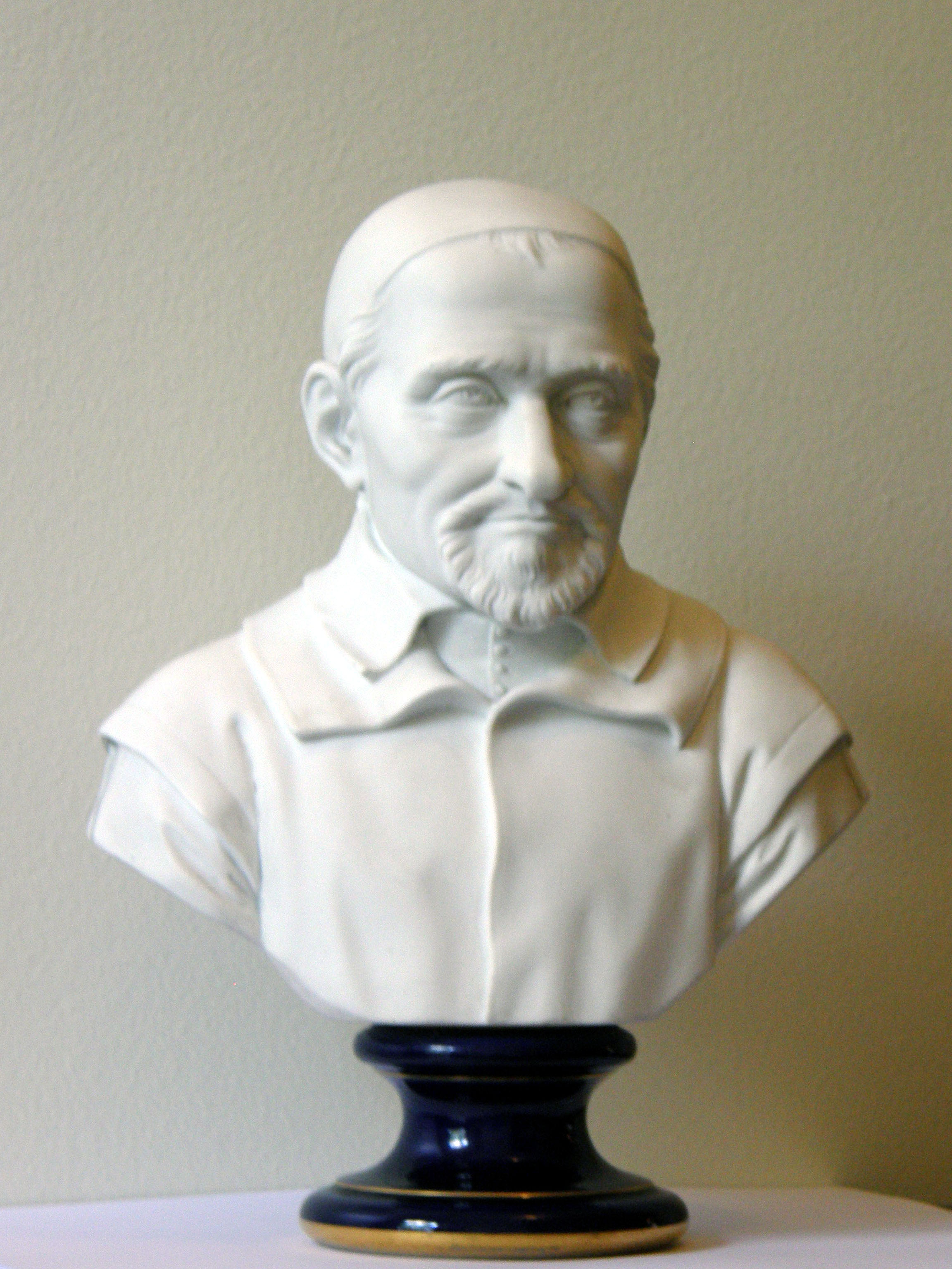 Portrait bust, Vincent de Paul, cassock, mantle, skullcap; Sevres porcelain bust on glazed base; original belonging to John Rybolt, DePaul University, Chicago