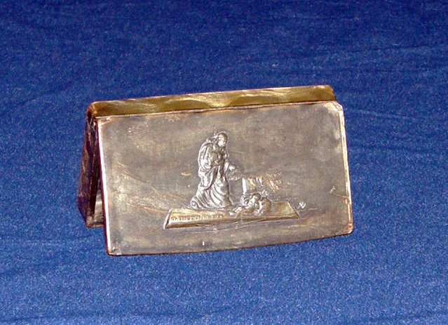 Vincent de Paul, standing, cassock, cape, gathering foundlings; on metal box; based on Monsiau painting (detail); original at DePaul University