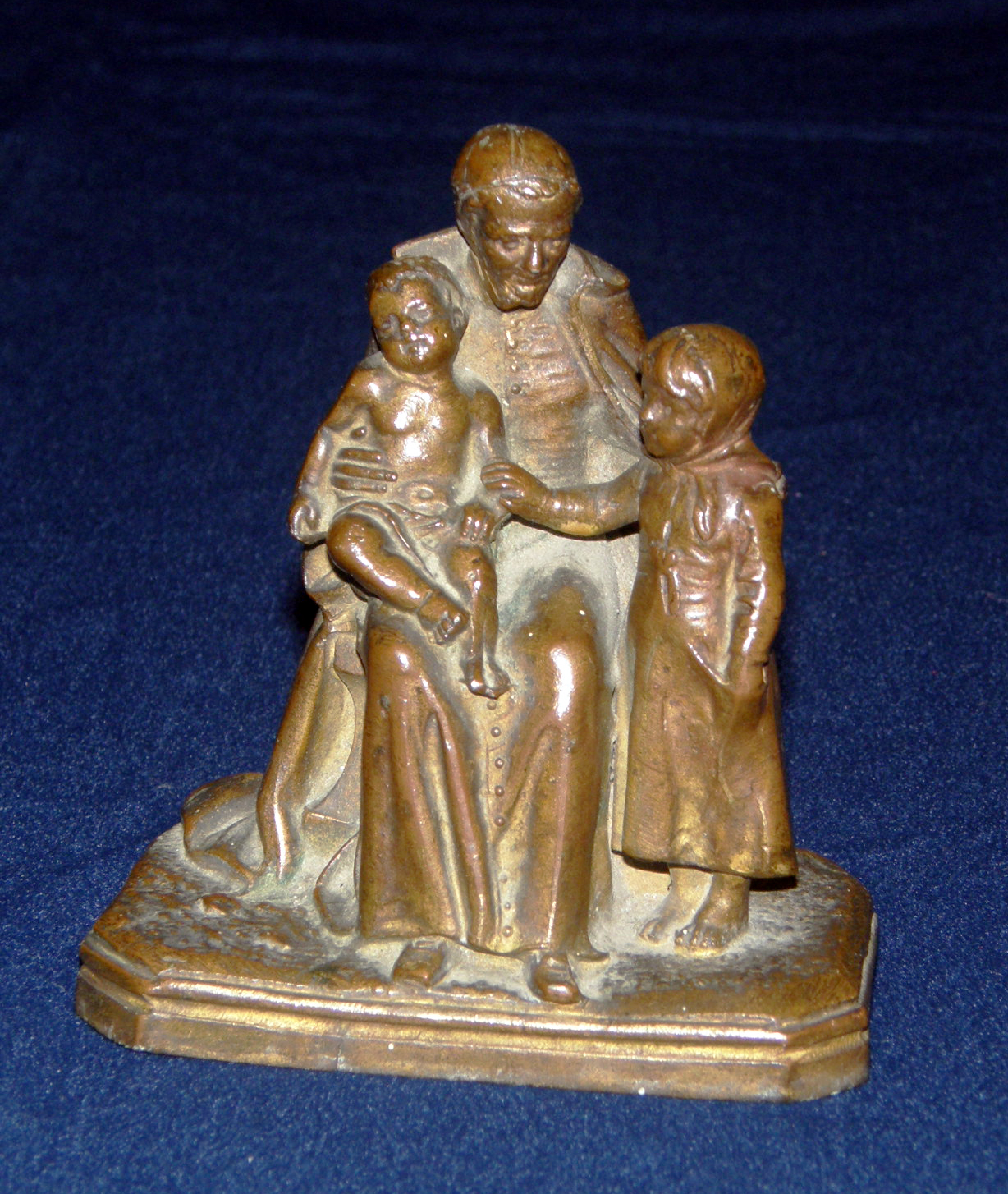 Bronze statue group, Vincent de Paul, seated, cassock, cincture, cape, skullcap; with two children; original at DePaul University, Chicago