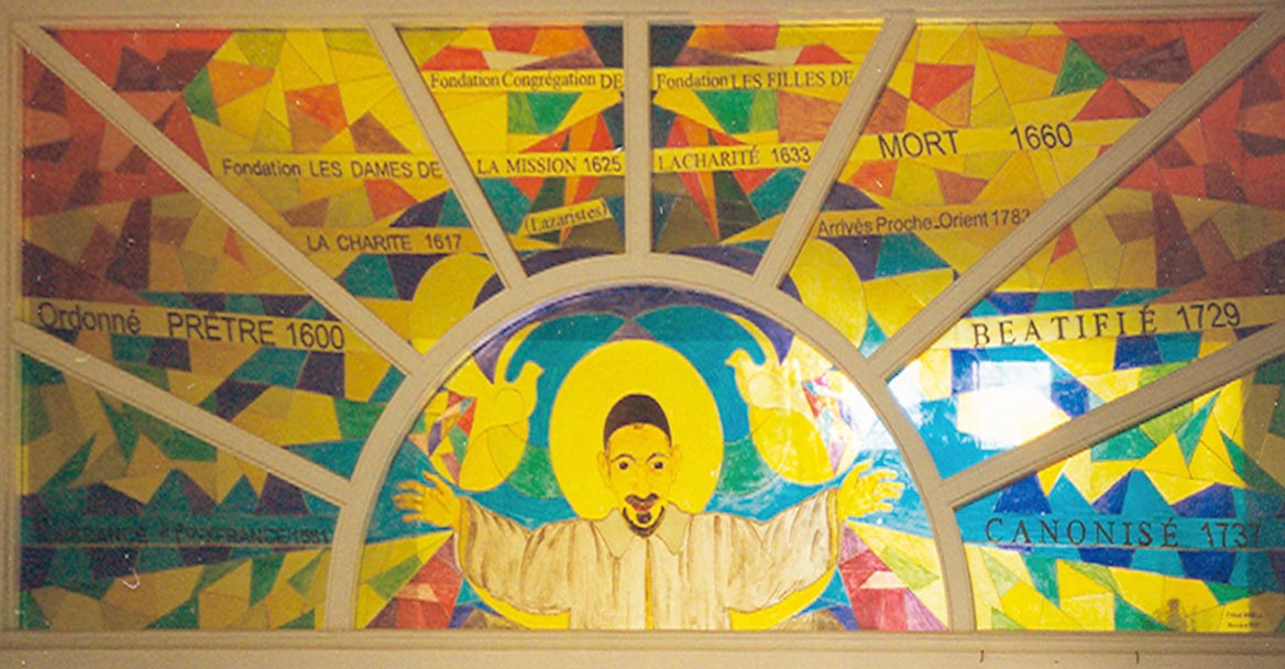 Vincent de Paul surrounded by important dates in his life; French text. Original (probably) in Vincentian house, Antoura, Lebanon.