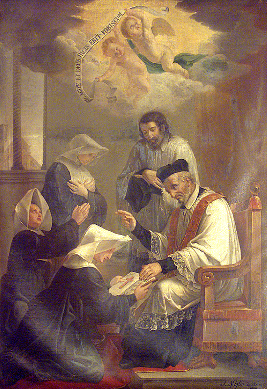 Oil on canvas; Vincent de Paul, seated, cassock, surplice, stole, biretta, Sisters kneeling; priest, probably Antoine Portail; Latin: "Do this, and the God of peace will be with you." Signed: A[ndrea] Miglio; original in Sisters' house, Turin