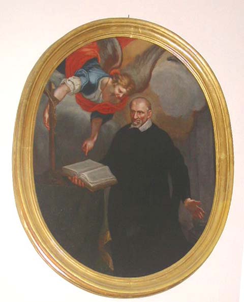 Framed oval, oil on canvas; Vincent de Paul, kneeling before crucifix, cassock, mantle, holding Bible; angel points to Bible; original in Sant'Andrea al Quirinale, Rome