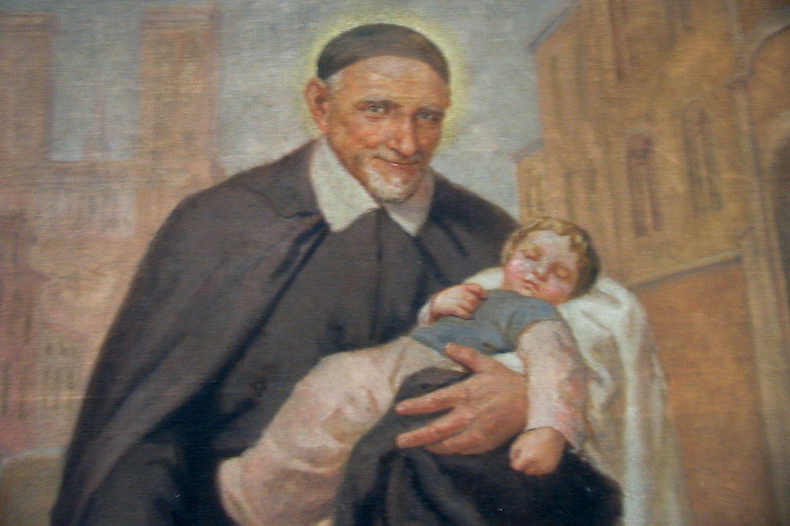 Detail of painting; Vincent de Paul, cassock, cape, skullcap, holding sleeping child; original in Vincentian house, Udine