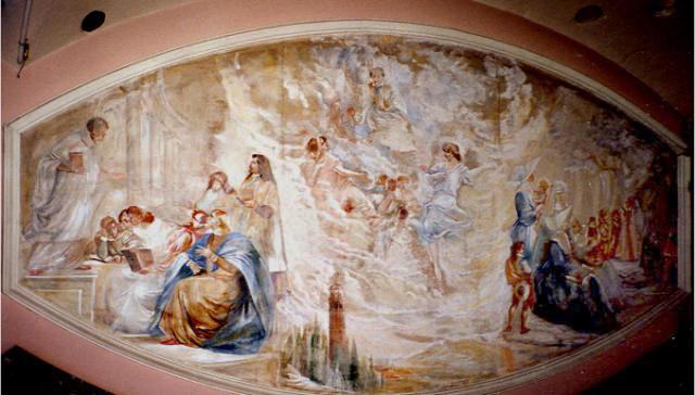 Mural; Vincent de Paul, standing, white cassock, surplice, red shoes, holding book, teaching; Vincent de Paul escorted by angels to heaven; Daughters of Charity with children; original in Daughters of Charity house, Udine