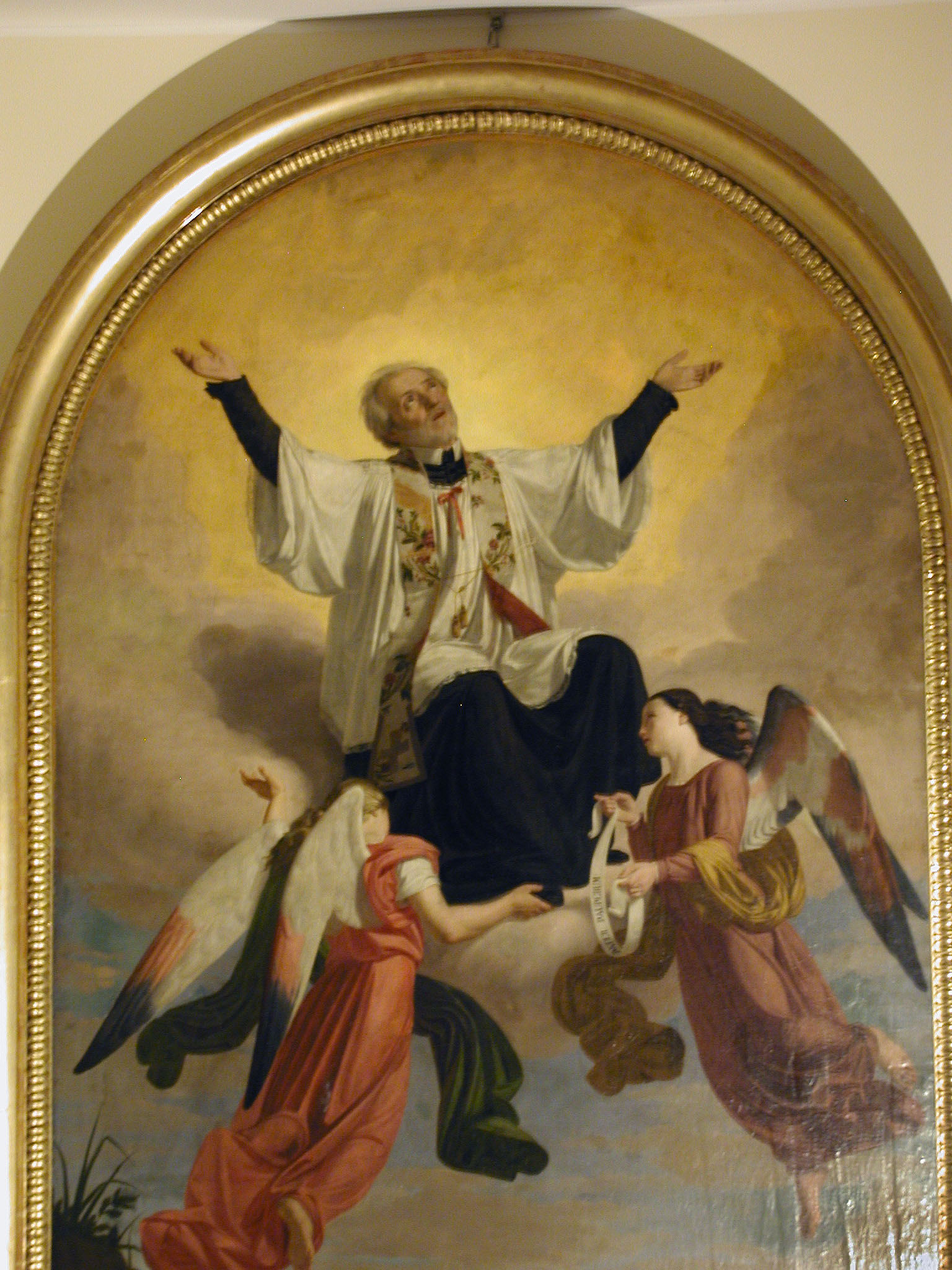 Framed oil on canvas; Vincent de Paul, seated, cassock, surplice, white stole, arms raised, escorted by angels, ribbon with text: Father of the poor; original in Vincentian provincial house, Turin