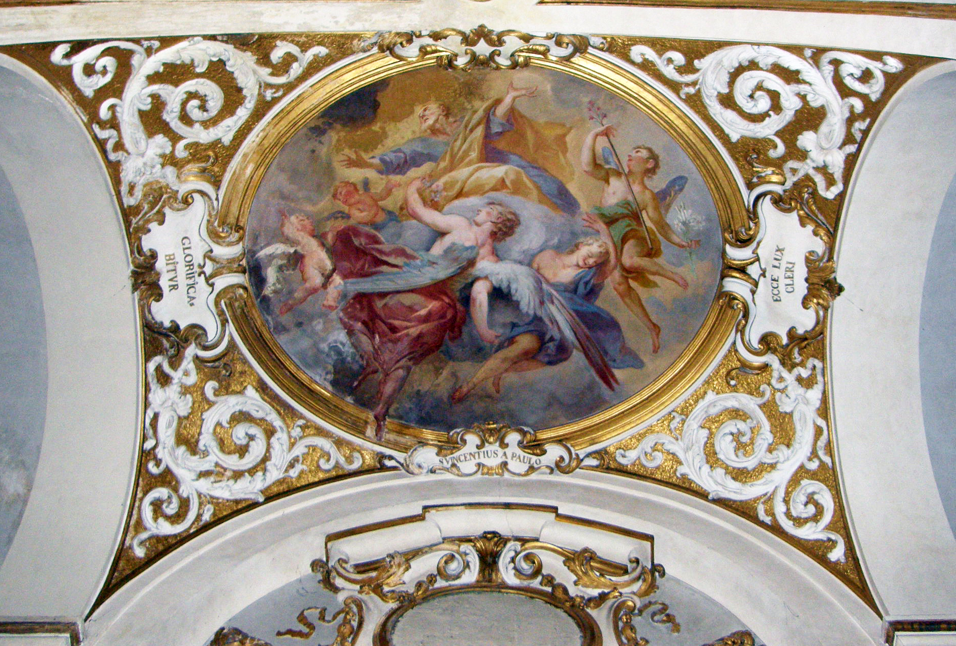 Vincent de Paul, in classical garments (blue, gold), escorted into heaven by angels; in former Vincentian church; Latin inscriptions: Behold the light of the Clergy, and, He will be glorified