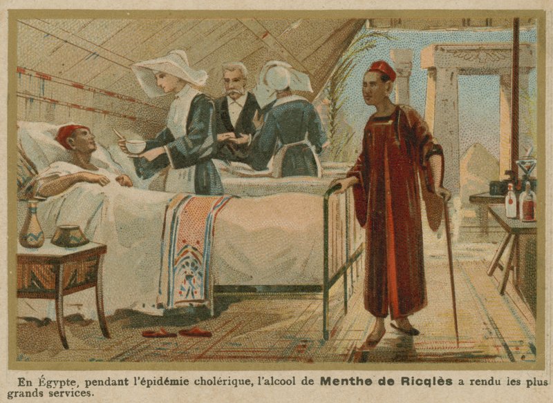 Text: In Egypt, during the cholera epidemic, the alcohol of Mint of Riqlès rendered the greatest services