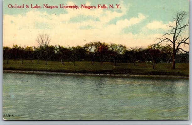 Orchard and lake in foreground