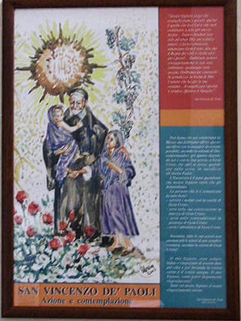 Publicity poster; Vincent de Paul, standing with two children; emblem of name of Jesus above; original in Vincentian parish, Lecce