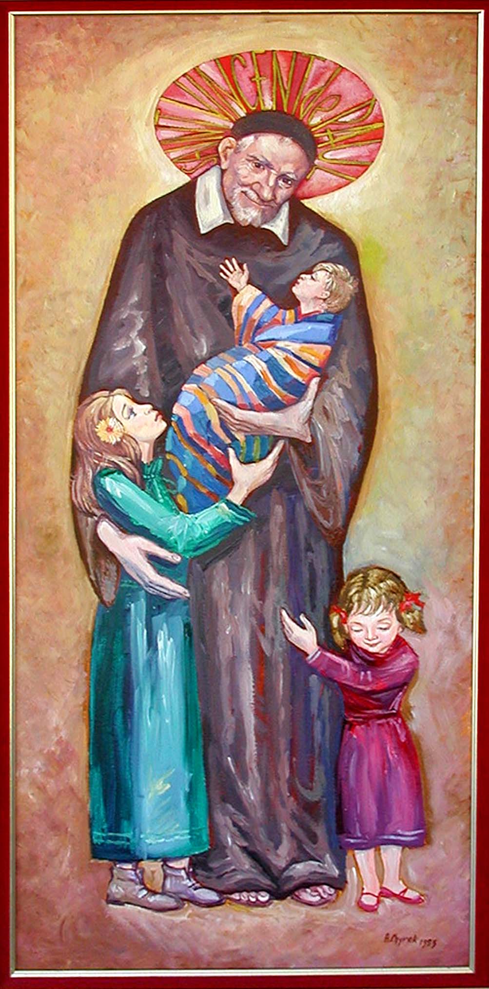 Framed oil painting, signed and dated Vincent de Paul, cassock, bare feet; three blond children; name in large halo; original in Vincentian house, Marshfield, Sydney