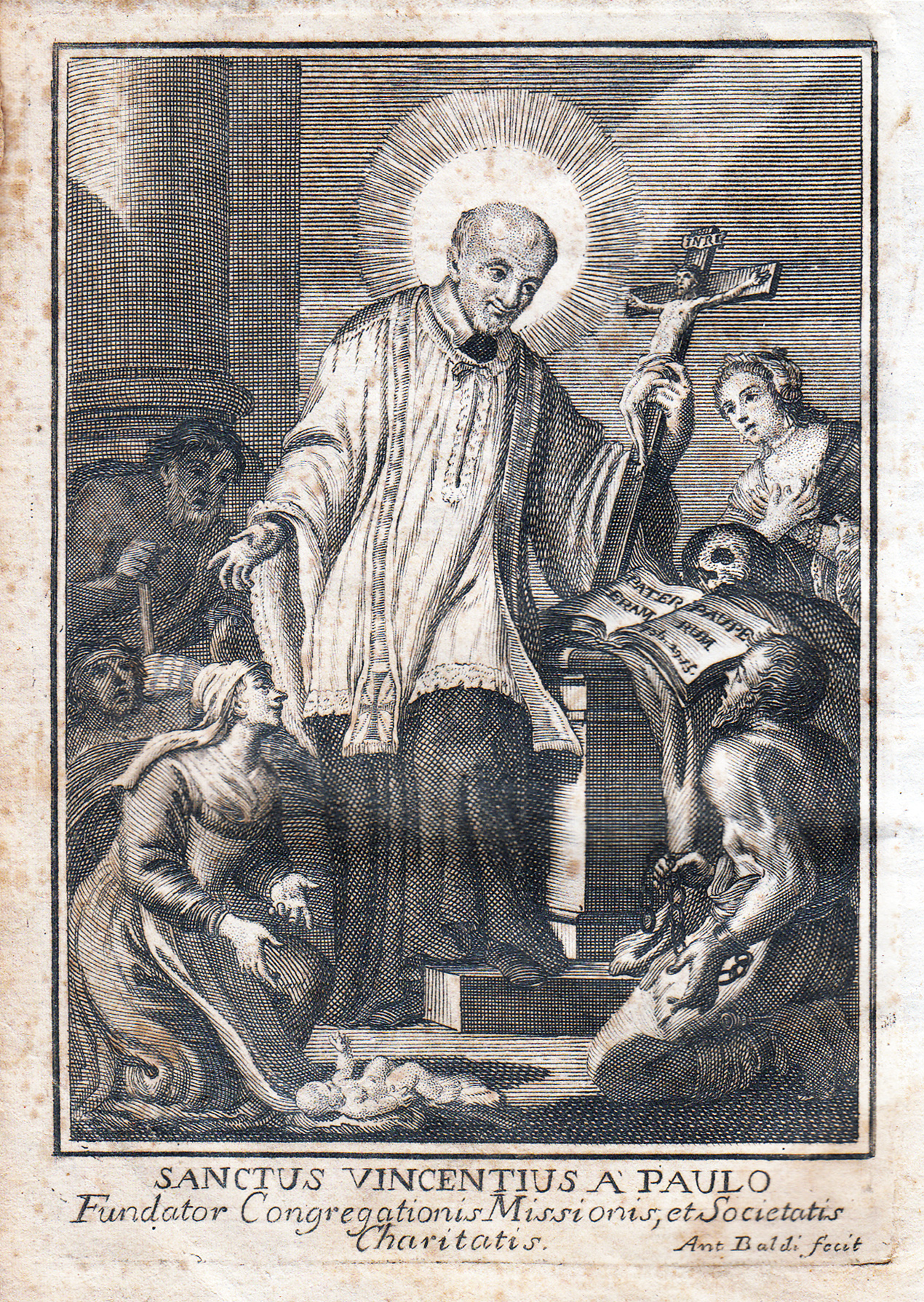 Frontispiece of Regole della Compagnia della Carita, Benevento, 1744.Text: SVdP, founder of the Congregation of the Mission and the Society [=Company of the Daughters] of Charity