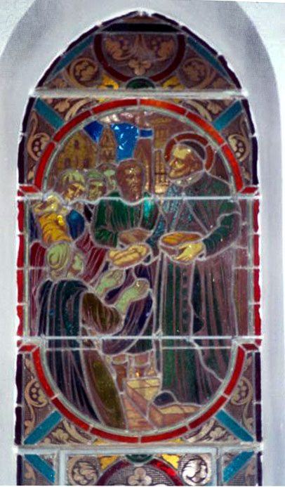 Vincent de Paul holding bread basket, distributes loaves to poor, men and women; original in bishop's house, Algiers