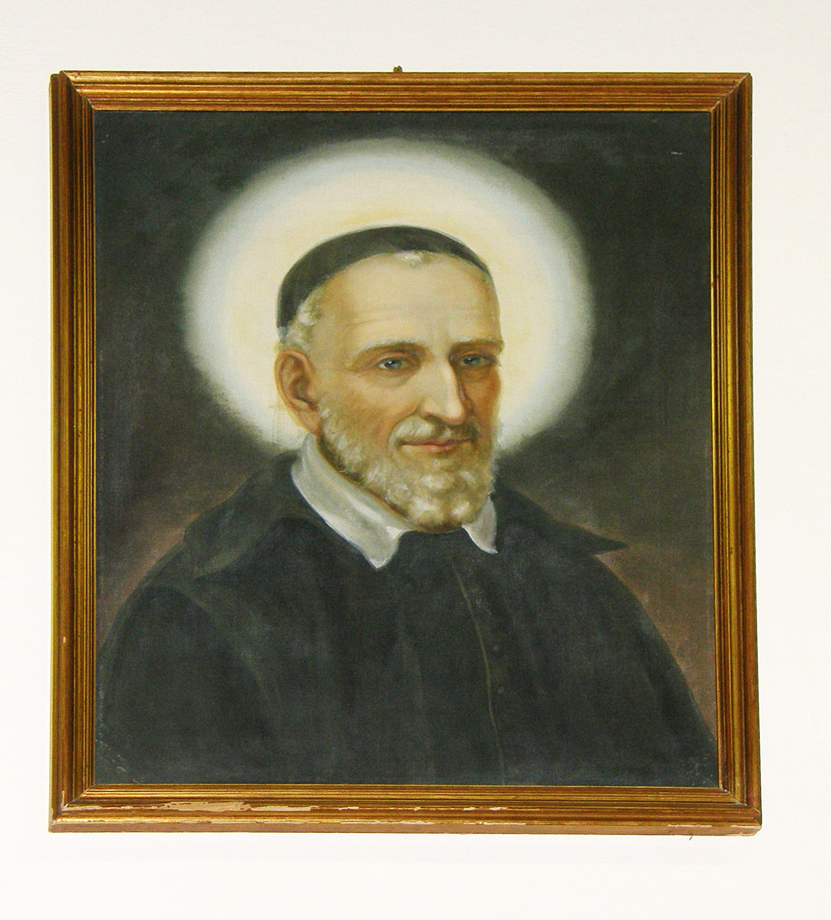 Vincent de Paul, seated, curly beard, white halo; original in Daughters of Charity provincial house, Siena