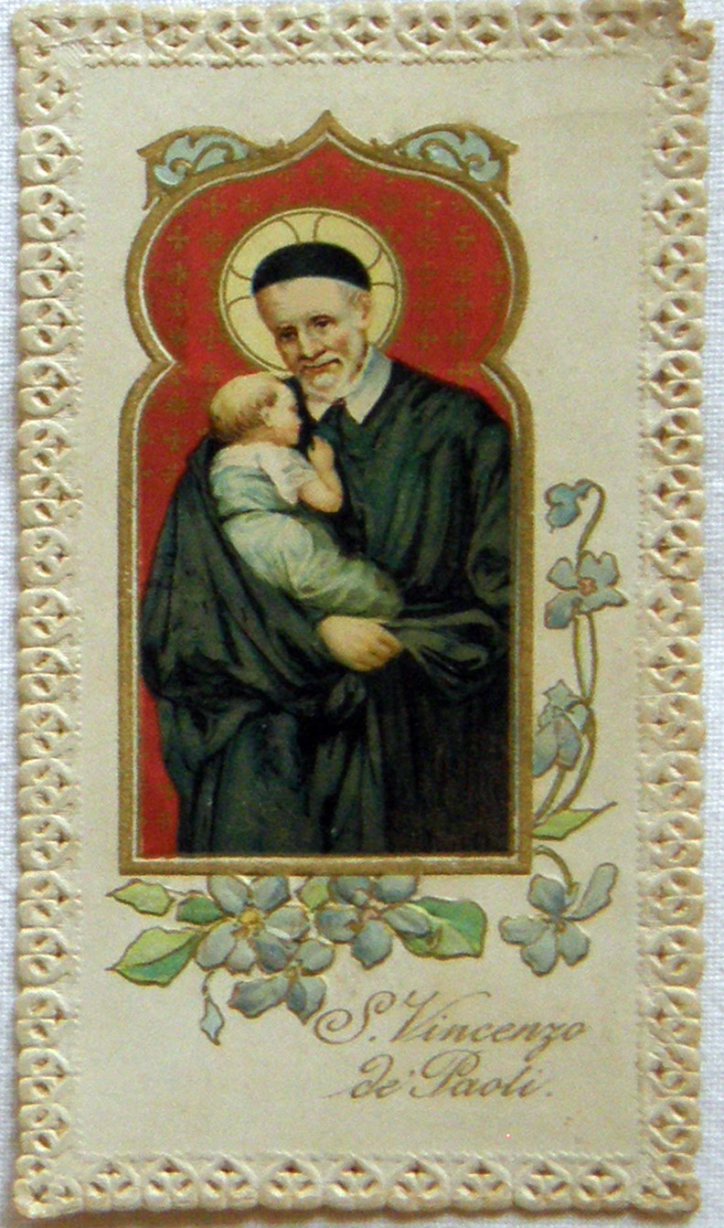 Vincent de Paul, standing, cassock, cape, sikullcap, halo; holding sleeping child; Italian form of his name; lace border; original in Daughters of Charity provincial archive, Turin