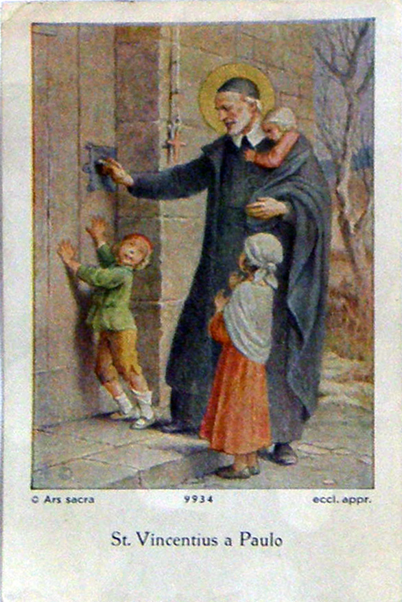 Vincent de Paul, standing, cassock, cincture, mantle, skullcap, halo; exterior scene, leafless tree; at orphanage door; original in Daughters of Charity provincial archive, Turin