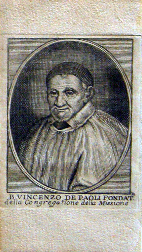 Engraving of Blessed Vincent de Paul, Moutiers St. Jean model, cassock, surplice, skullcap; Italian text; original in Daughters of Charity archive, Turin