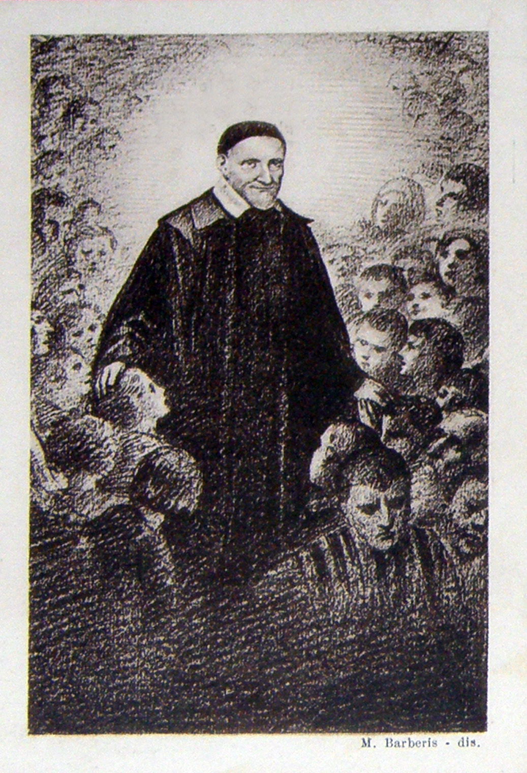 Vincent de Paul, standing, cassock, mantle, skullcap; with boys and girls surrounding; original in Collegio Leoniano, Rome; see another version, Italy 05