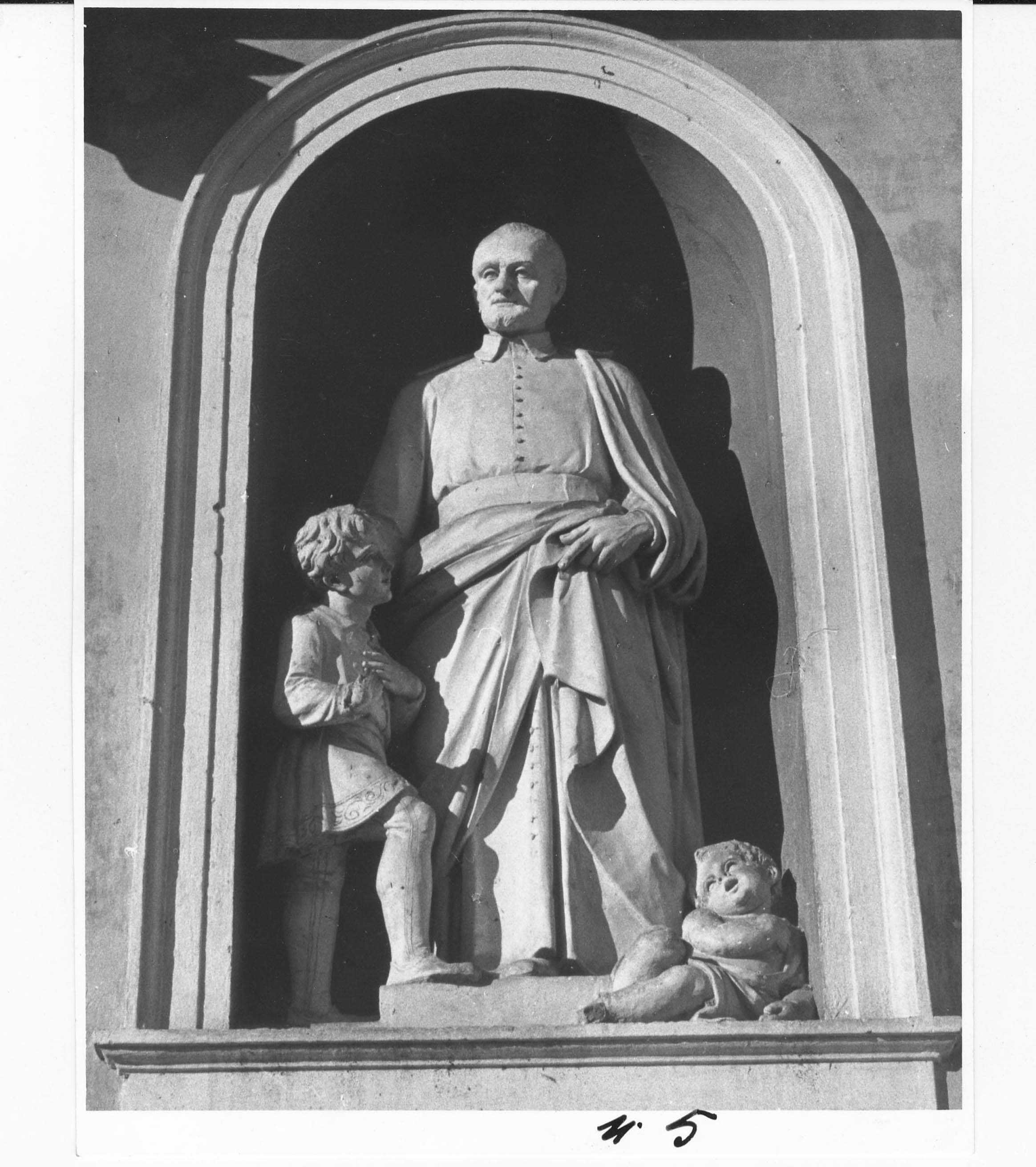 Photograph of stone statue, dated 1874; Vincent de Paul, cassock, cape, with two children; original in Salusso