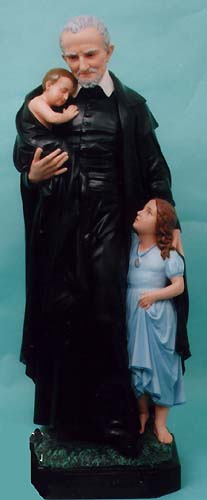 Vincent de Paul holding infant; girl with Miraculous Medal, like Child of Mary; commercial internet image (Centro Mariano)