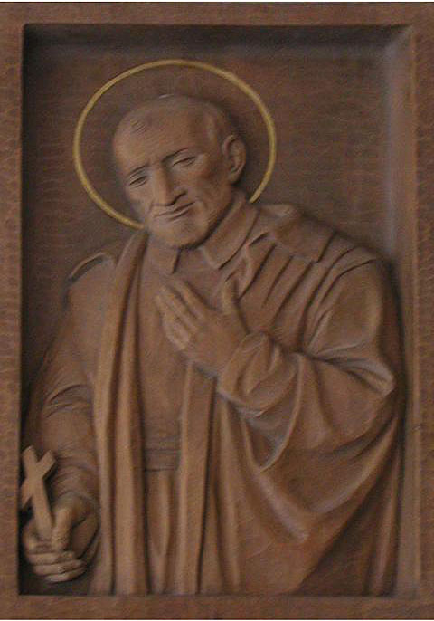 Carved wooden plaque, Vincent de Paul, cassock and mantle, contemplating crucifix; gilded halo; original in Collegio Leoniano, Rome