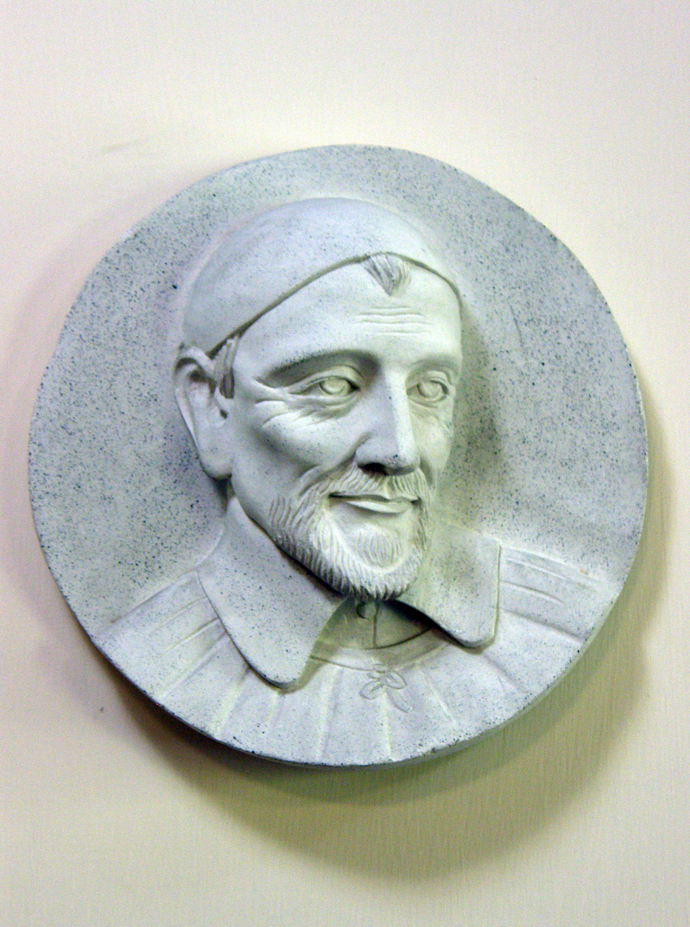 Round plaque, composite material, Vincent de Paul, cassock, surplice, skullcap; original in Vincentian General Curia, Rome