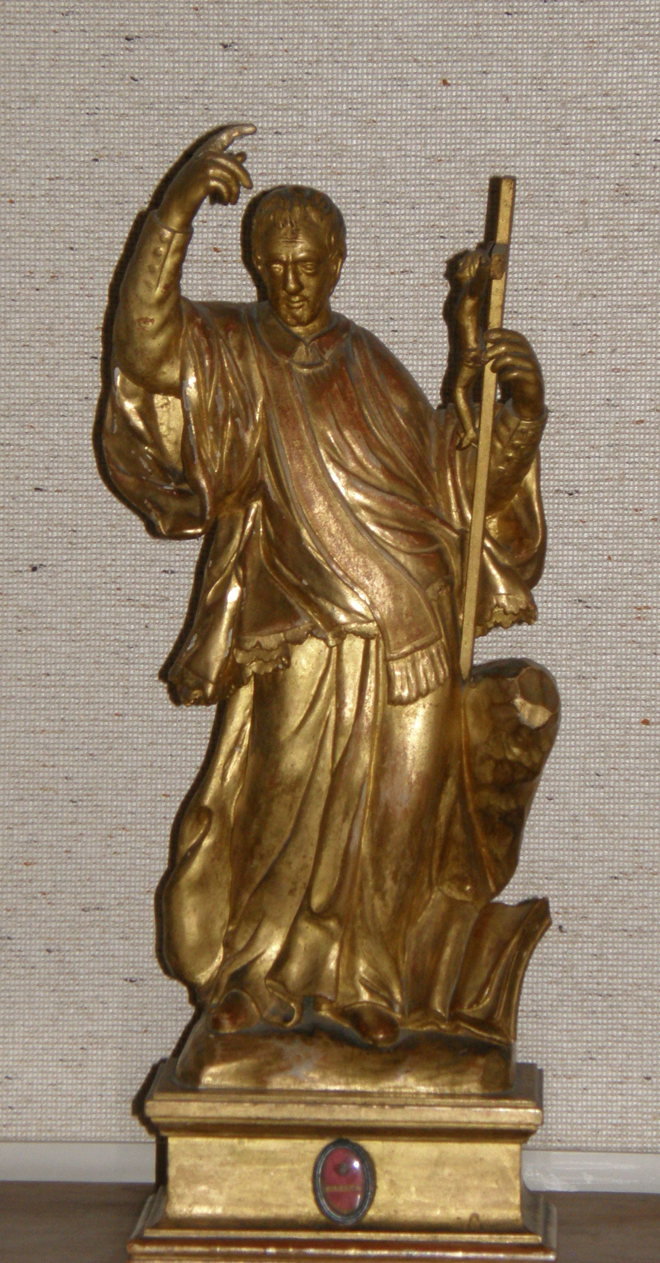 Gilded wooden statue, Vincent de Paul, standing, cassock, surplice, stole, holding crucifix, based on Bracci statue in Vatican; oval reliquary on base; original in Daughters of Charity provincial house, Turin
