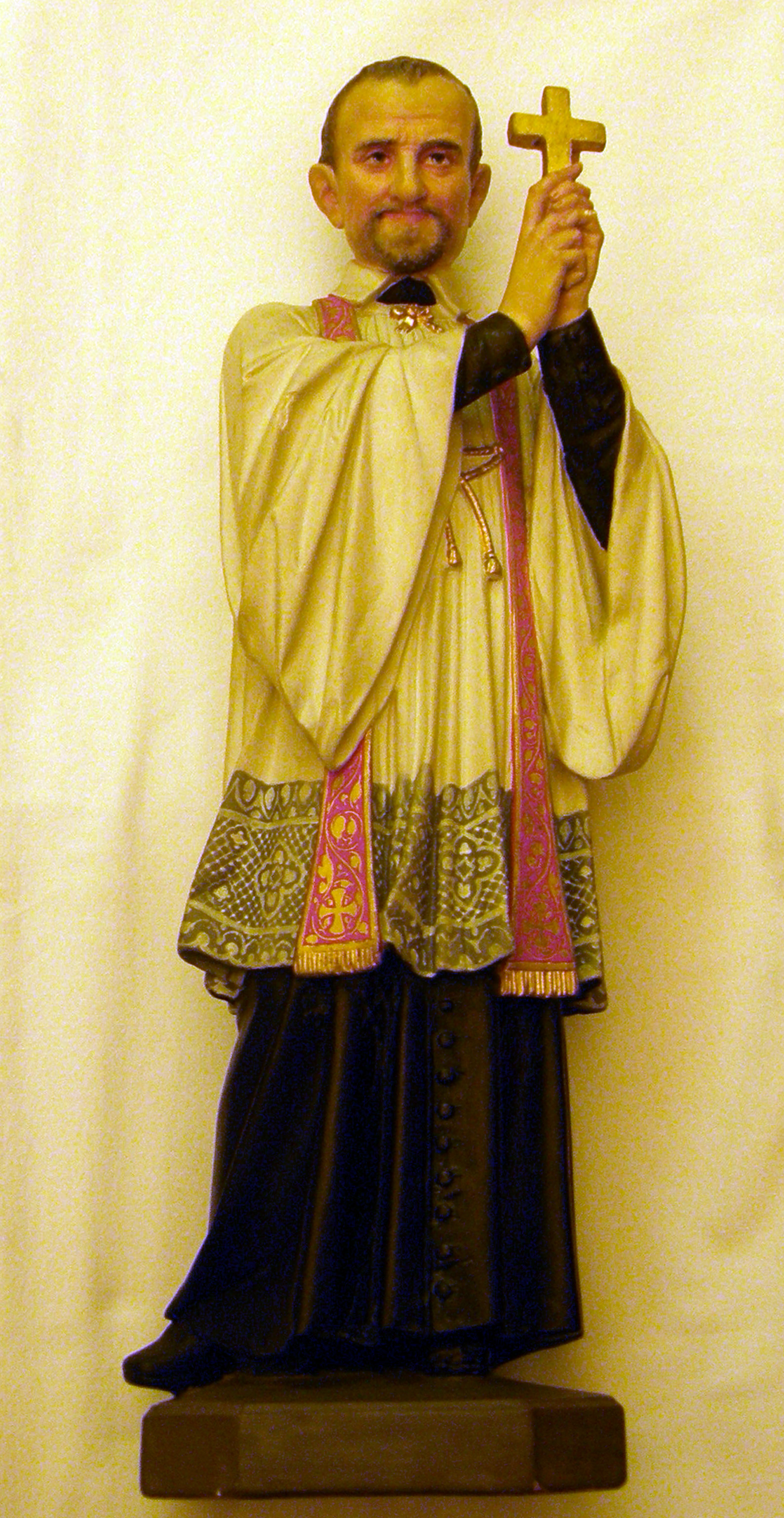 Painted plaster, Vincent de Paul, standing, cassock, surplice, stole, holding crucifix in two hands; original in Daughters of Charity provincialate, Turin