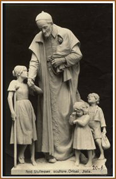 Wood sculpture; Vincent de Paul, standing, cassock, mantle, skullcap, with four children; commercial photo (internet), from studio of Ferdinand Stuflesser